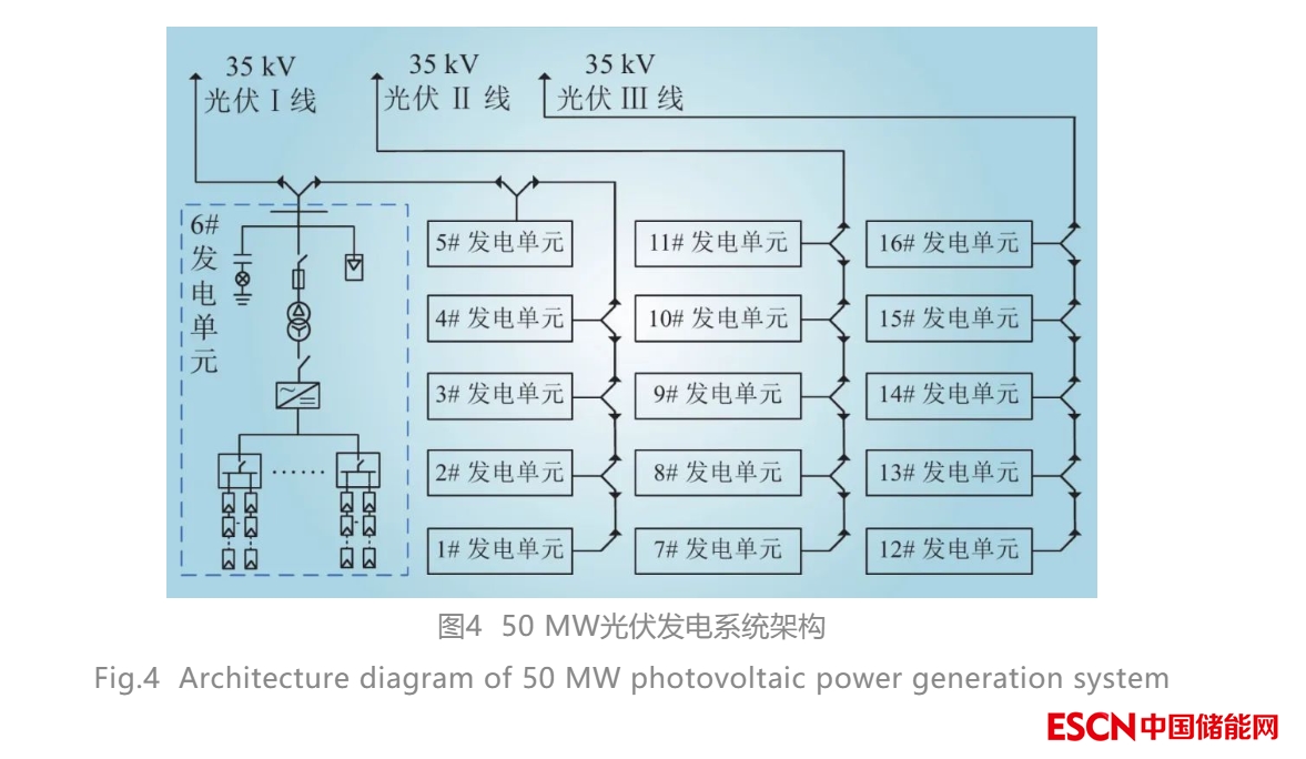 采用“分區(qū)發(fā)電、集中并網(wǎng)”模式將50 MW光伏發(fā)電系統(tǒng)劃分為16個容量均為3.125 MW的發(fā)電單元,通過并網(wǎng)光伏逆變器將光伏組件所發(fā)直流電轉(zhuǎn)化為交流電,經(jīng)變壓器升壓后接入35 kV交流母線,50 MW光伏發(fā)電系統(tǒng)架構(gòu)如圖4所示。