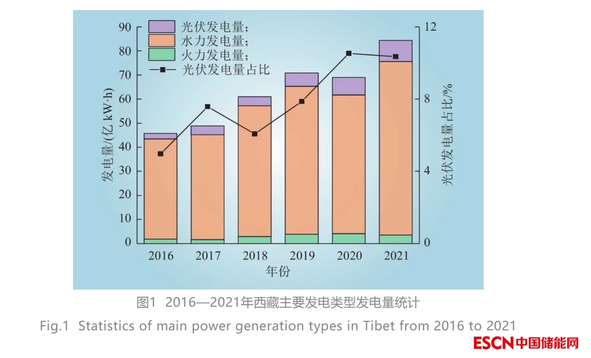 從電源結(jié)構(gòu)來看,西藏以水電為主,以光伏、火電作為輔助電源。圖1為2016—2021年西藏自治區(qū)水電、火電、光伏發(fā)電量統(tǒng)計,由圖1可知,近年來西藏光伏發(fā)電得到了大力發(fā)展,其發(fā)電量由2016年的2.27億kW·h上升至2021年的8.73億kW·h,發(fā)電量占比由4.97%提高至10.35%。