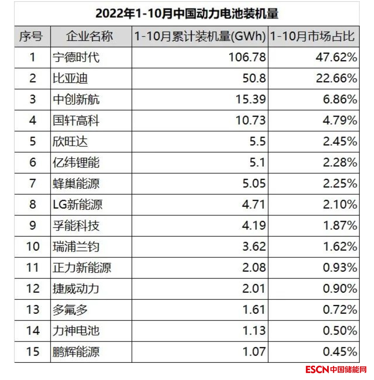2022年1-10月,我國(guó)動(dòng)力電池裝機(jī)量224.2GWh,同比增長(zhǎng)108.7%。其中三元電池裝機(jī)量88.0GWh,占總裝機(jī)量39.2%,同比增長(zhǎng)62.8%;磷酸鐵鋰電池裝機(jī)量136.0GWh,占總裝機(jī)量60.6%,同比增長(zhǎng)155.6%,呈現(xiàn)快速增長(zhǎng)發(fā)展勢(shì)頭。1-10月,我國(guó)新能源汽車(chē)市場(chǎng)共計(jì)51家動(dòng)力電池企業(yè)實(shí)現(xiàn)裝機(jī)配套,較去年同期減少3家,排名前10家動(dòng)力電池企業(yè)裝機(jī)量211.9GWh,占總裝機(jī)量94.5%。