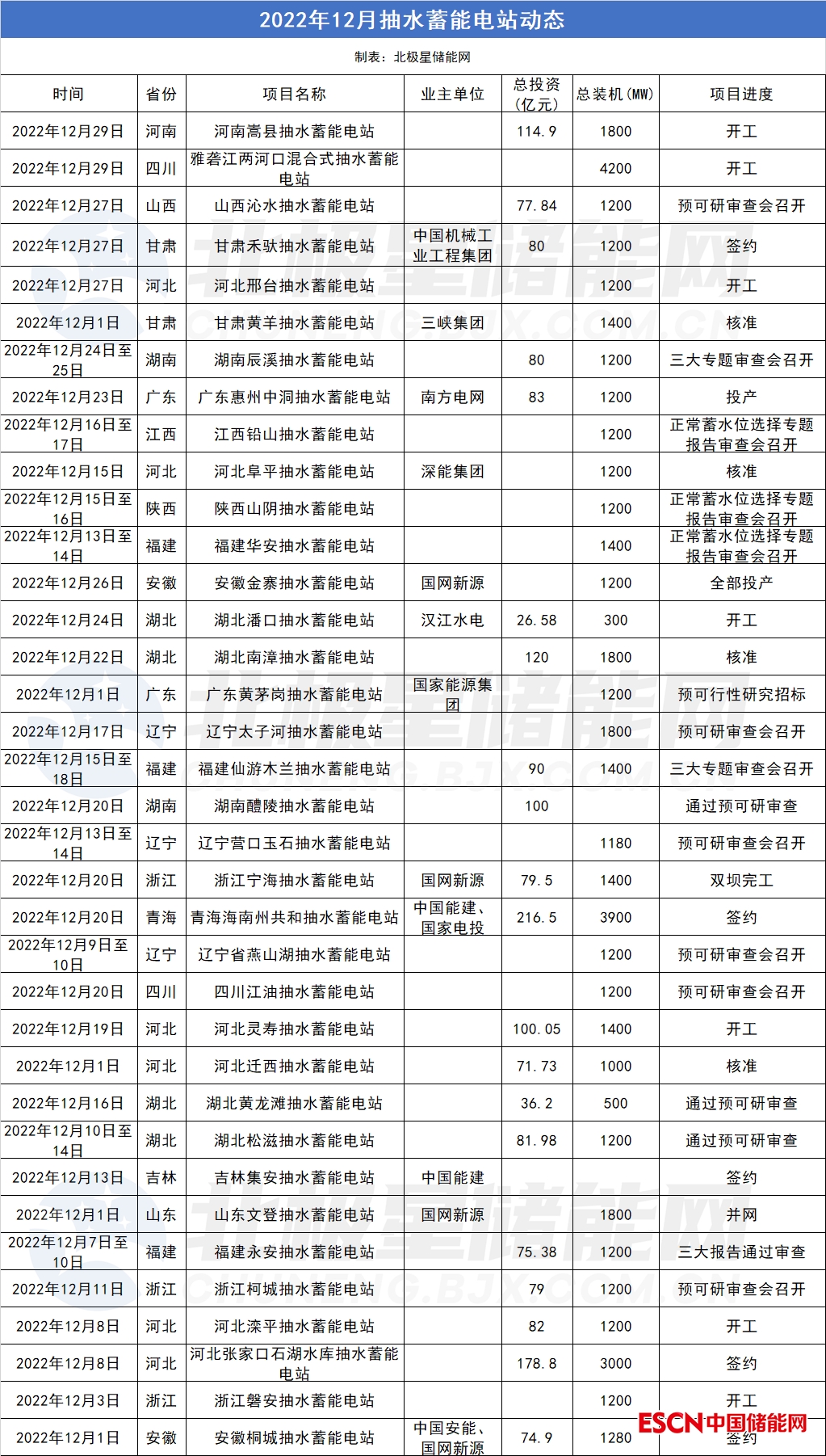 中國(guó)儲(chǔ)能網(wǎng)訊:據(jù)不完全統(tǒng)計(jì),2022年12月共有36個(gè)總裝機(jī)容量49960MW的抽水蓄能電站啟動(dòng)預(yù)可研審查、核準(zhǔn)、開(kāi)工、投產(chǎn)等。