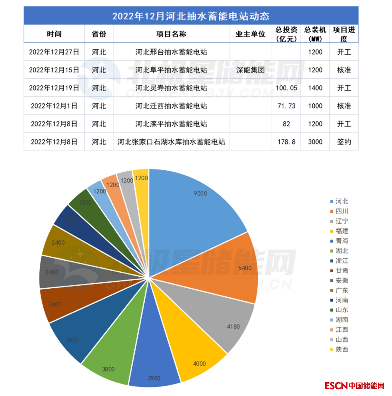 在全國(guó)各省份來(lái)看,河北在2022年12月抽水蓄能電站更新動(dòng)態(tài)最多,共6個(gè)抽水蓄能項(xiàng)目9000MW。