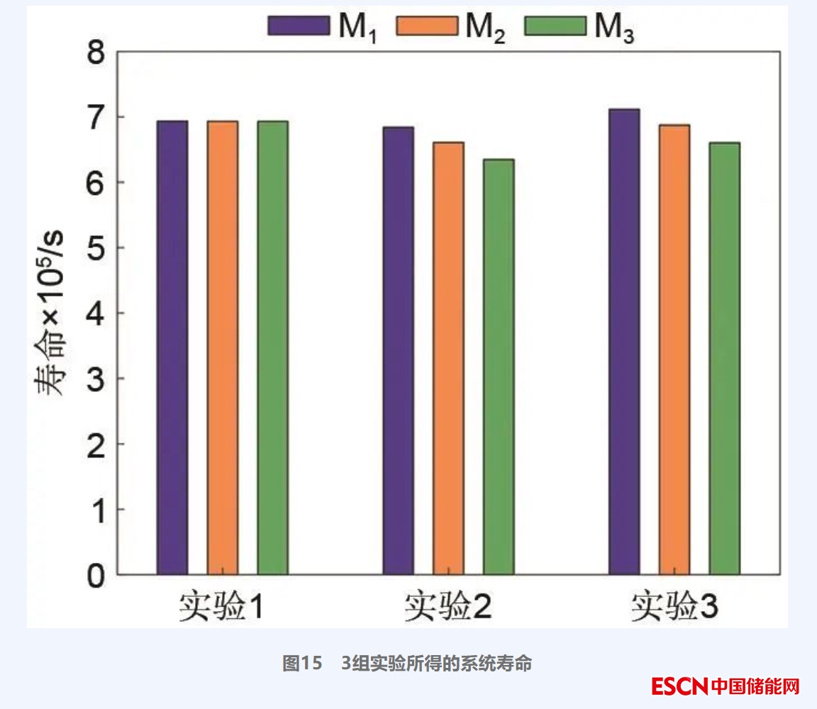 根據(jù)圖15可知,實(shí)驗(yàn)1中M1~M3的壽命分別為693298 s、693083 s、693084 s;實(shí)驗(yàn)2中M1~M3的壽命分別為684051 s、660828 s、634667 s;實(shí)驗(yàn)3中M1~M3的壽命分別為711607 s、687305 s、660229 s。另外,實(shí)驗(yàn)1中各模組的平均壽命差為143 s,最大壽命差為215 s,實(shí)驗(yàn)2中各模組的平均壽命差為32923 s,最大壽命差為49384 s,實(shí)驗(yàn)3中各模組的平均壽命差為34252 s,最大壽命差為51378 s。故由3組實(shí)驗(yàn)的實(shí)驗(yàn)數(shù)據(jù)可知實(shí)驗(yàn)1中3個(gè)并聯(lián)模組的壽命幾乎相同,而實(shí)驗(yàn)2和實(shí)驗(yàn)3中的3個(gè)并聯(lián)模組的壽命差則非常大。對(duì)于實(shí)驗(yàn)2和3的情況而言,若M2和M3提前達(dá)到截止壽命時(shí),各個(gè)并聯(lián)模組之間不再具備互為備用的關(guān)系,系統(tǒng)可靠性降低,需要運(yùn)維人員及時(shí)更換電池模塊。而并聯(lián)的電池模組數(shù)目越多,運(yùn)維的成本也就越大。若將本文所提方法應(yīng)用到實(shí)際場(chǎng)站,則可以在整個(gè)運(yùn)行過程中始終保障備用電源系統(tǒng)的高可靠性,且僅需在各個(gè)模組到達(dá)截止壽命時(shí),對(duì)備用電源進(jìn)行一次運(yùn)維。另外,圖15中,實(shí)驗(yàn)1中各電池模組的平均壽命為693155 s,實(shí)驗(yàn)2中各電池模組的平均壽命為659849 s。故對(duì)比實(shí)驗(yàn)1和實(shí)驗(yàn)2可知,在使電池模組組內(nèi)電池單體的SOC保持一致的基礎(chǔ)上,使用本文所提的多時(shí)間尺度均衡算法可以延長系統(tǒng)的平均壽命。這也間接說明僅考慮電池短時(shí)間尺度的均衡,不考慮電池長時(shí)間尺度的均衡,并不能在長時(shí)間尺度最大化利用電池的能量。