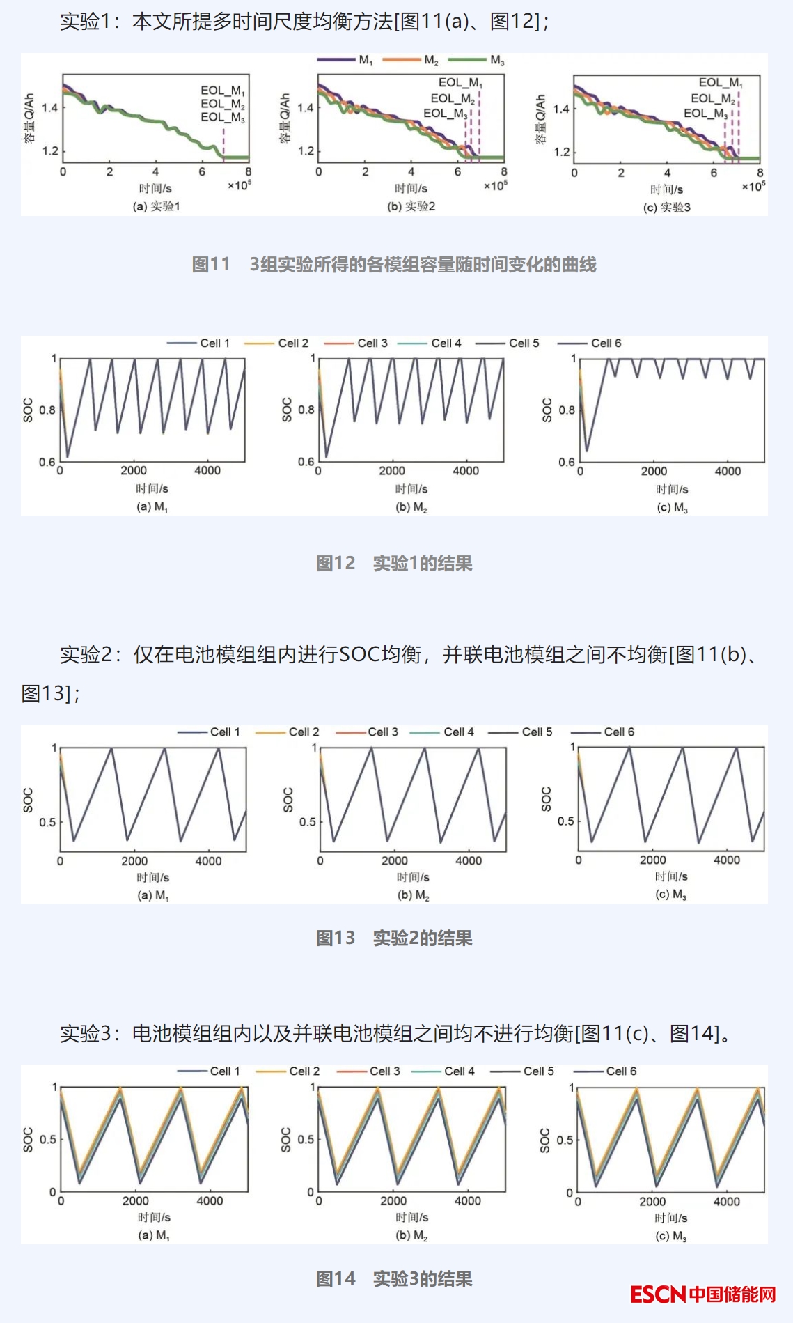 為了合理設(shè)計(jì)該均衡方法,根據(jù)電池工作特性設(shè)計(jì)了包含電池模組組內(nèi)SOC旁路均衡算法和基于功率加權(quán)的壽命均衡控制算法的多時(shí)間尺度均衡算法。為了驗(yàn)證所提均衡算法的可行性以及有效性,對(duì)鋰電池進(jìn)行了HPPC以及加速老化測(cè)試,然后根據(jù)試驗(yàn)數(shù)據(jù),建立了鋰電池電-老化模型。最后,設(shè)計(jì)了3組對(duì)比實(shí)驗(yàn)。實(shí)驗(yàn)結(jié)果顯示文章所提的多時(shí)間尺度均衡算法不僅可以保持電池模組組內(nèi)SOC均衡,也能在長時(shí)間尺度上讓各電池模組同時(shí)達(dá)到壽命終止,兼顧單體SOC的一致性和電池模組壽命的一致性。這不僅解決了串聯(lián)電池組的木桶效應(yīng),也減少了電池的更換次數(shù),降低系統(tǒng)的運(yùn)維成本。