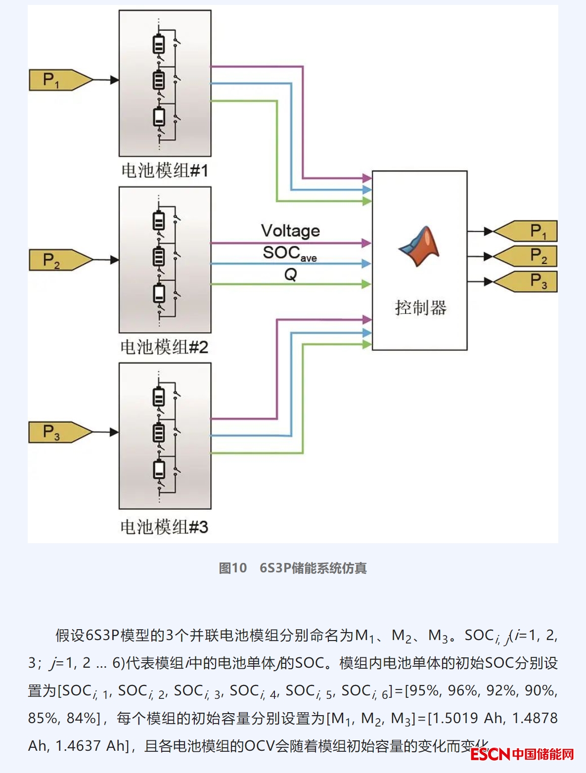 為了驗(yàn)證所提算法的效果,設(shè)計(jì)了3組對(duì)比實(shí)驗(yàn),利用MATLAB/Simulink仿真平臺(tái)搭建了由3組電池模組并聯(lián)組成的小型儲(chǔ)能系統(tǒng),其中3個(gè)并聯(lián)電池模組由6塊電池單體串聯(lián)組成(6S3P),且設(shè)定恒功率負(fù)載為P=500 W。圖10為儲(chǔ)能系統(tǒng)的仿真示意圖,控制器中包含完整的均衡算法。控制器根據(jù)電池模組電壓、SOC、容量等參數(shù)輸出電池模組需要輸出的功率并將該功率反饋給各電池模組。