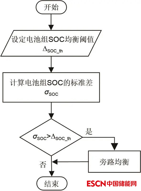 串聯(lián)電池組SOC旁路均衡算法的基本策略是:根據(jù)電池組SOC值的標(biāo)準(zhǔn)差判斷電池組是否需要均衡。若電池組SOC的標(biāo)準(zhǔn)差小于所設(shè)定的閾值,表示電池組SOC不需要均衡,則電池組串聯(lián)運(yùn)行。若電池組SOC的標(biāo)準(zhǔn)差大于所設(shè)定的閾值,則需要對(duì)電池組進(jìn)行旁路均衡。假定電池組需要旁路Nbypass塊單體,判斷此時(shí)電池組的充放電狀態(tài)。若電池組放電,則通過控制開關(guān)陣列旁路Nbypass塊能量最低的電池單體;若電池組充電,則通過控制開關(guān)陣列旁路Nbypass塊能量最高的電池單體。該算法的流程如圖5所示。