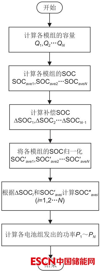 并聯(lián)電池模組壽命均衡的本質(zhì)是根據(jù)各模組的健康狀態(tài)控制電池的放電深度,整體原則為:剩余壽命越少,則該組電池模組的放電深度越淺;剩余壽命越多,則該組電池模組的放電深度越深。結(jié)合本文的拓?fù)浣Y(jié)構(gòu),利用DC-DC轉(zhuǎn)換器調(diào)控各電池模組的發(fā)出功率,就可以達(dá)到控制模組放電深度的目的。故根據(jù)上述原理,本文提出了基于功率加權(quán)的壽命均衡控制算法,如圖4所示:首先計(jì)算各電池模組應(yīng)該提供的補(bǔ)償SOC;然后將各電池模組的容量除以參考容量,得到關(guān)于荷電量的權(quán)重因數(shù),并利用該因數(shù)去修正各電池模組的SOC(即歸一化)。最后,再將各電池模組的SOC除以各電池模組SOC之和,得到關(guān)于功率的權(quán)重因數(shù),并根據(jù)該因數(shù)和補(bǔ)償SOC得到各電池模組需要提供的實(shí)際功率。算法的具體內(nèi)容如下: