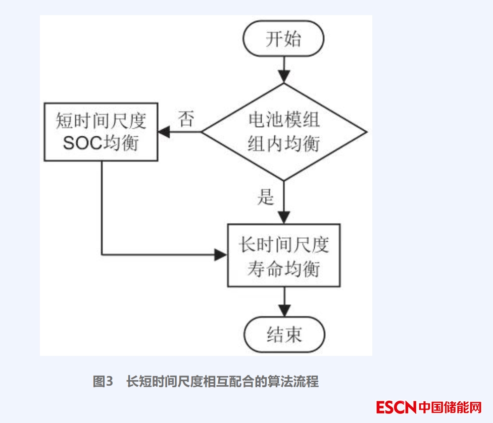 本文所提對(duì)串并聯(lián)電池組的多時(shí)間尺度均衡方法:在短時(shí)間尺度內(nèi),使串聯(lián)電池組組內(nèi)SOC在短時(shí)間內(nèi)快速達(dá)到均衡;在長時(shí)間尺度上,根據(jù)并聯(lián)電池模組的老化程度調(diào)節(jié)其充放電深度,以此實(shí)現(xiàn)壽命均衡。圖3描述了均衡算法中長短時(shí)間尺度均衡如何協(xié)調(diào):當(dāng)串聯(lián)電池組組內(nèi)SOC在短時(shí)間快速達(dá)到均衡后就可以啟動(dòng)長時(shí)間尺度壽命均衡。