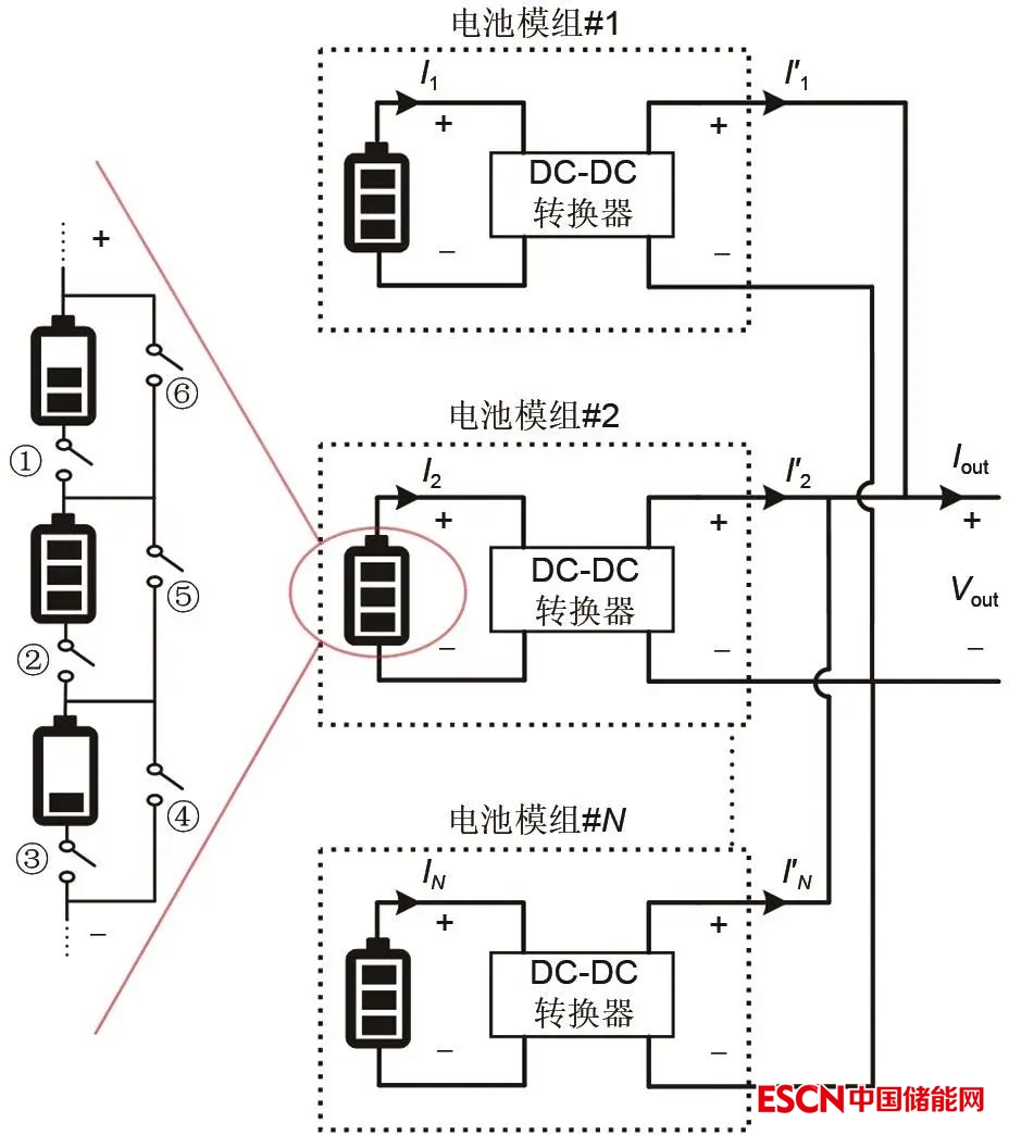 并聯(lián)電池組的均衡電路需要與電池/電池組隔離,常用的均衡拓?fù)浣Y(jié)構(gòu)為每個(gè)電池模組配備獨(dú)立的DC-DC轉(zhuǎn)換器,使得每組電池的充/放電量可以獨(dú)立控制。Moo等通過為并聯(lián)電池組中的每塊電池單體配備DC-DC轉(zhuǎn)換器獨(dú)立控制每塊電池的電流。該方法不僅能夠避免電池組過充放,同時(shí)也有利于電池組工作過程的SOC、SOH(state of health,健康狀態(tài))估計(jì)。Cao等提出了一種多輸入單輸出的電池系統(tǒng),即為每組電池模塊配備獨(dú)立的DC-DC轉(zhuǎn)換器后將所有模組串聯(lián)為負(fù)載供電。該系統(tǒng)不僅能夠使并聯(lián)電池組達(dá)到SOC均衡,也能在文獻(xiàn)[32]所提均衡拓?fù)浠A(chǔ)上減少電池系統(tǒng)所需的元件數(shù)。Ur Rehman等則為每塊電池配備獨(dú)立的DC-DC轉(zhuǎn)換器后,設(shè)計(jì)算法增加高SOH電池的放電深度,以提高電池衰減的一致性、延長電池組的整體壽命。