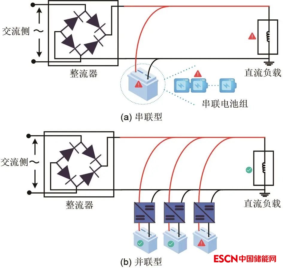 后備電源在系統(tǒng)發(fā)生故障時(shí),能夠保障核心設(shè)備的正常工作。相比于閥控密閉鉛酸電池,鋰離子電池(以下簡(jiǎn)稱“鋰電池”)因能量密度高、無記憶性、低自放電率、綠色環(huán)保等優(yōu)勢(shì)被廣泛應(yīng)用于電力直流電源系統(tǒng)。后備電源的傳統(tǒng)技術(shù)方案是將多節(jié)電池串聯(lián)成組后并入直流母線,如圖1(a)所示。該技術(shù)方案最為明顯的缺點(diǎn)是:若單節(jié)電池?fù)p壞,后備系統(tǒng)將直接故障。對(duì)于高壓故障,如無法提供后備操作電源,將導(dǎo)致本級(jí)斷路器無法分閘,甚至直接使上級(jí)電網(wǎng)跳閘。另外,由于電池單體電壓一般在4 V左右,為了滿足直流系統(tǒng)高電壓的需求,需要將幾十甚至上百節(jié)單體串聯(lián)。而串聯(lián)電池越多,各電池單體之間的均衡就越復(fù)雜。所以,針對(duì)上述傳統(tǒng)技術(shù)方案的缺點(diǎn),出現(xiàn)了先串聯(lián)電池后并聯(lián)模組的并聯(lián)型備用電源方案,并聯(lián)型方案如圖1(b)所示。即先將性能相對(duì)一致的電池串聯(lián)成組,再為各串聯(lián)電池組配備獨(dú)立的DC-DC轉(zhuǎn)換器并聯(lián)后為負(fù)載供電。以這種并聯(lián)模組代替后備電源傳統(tǒng)的串聯(lián)模式,不僅避免了因某塊電池單體故障導(dǎo)致整個(gè)串聯(lián)電池組無法使用的木桶效應(yīng),并且并聯(lián)模組之間能夠互為備用,顯著提高了后備電源的可靠性與能量利用率。