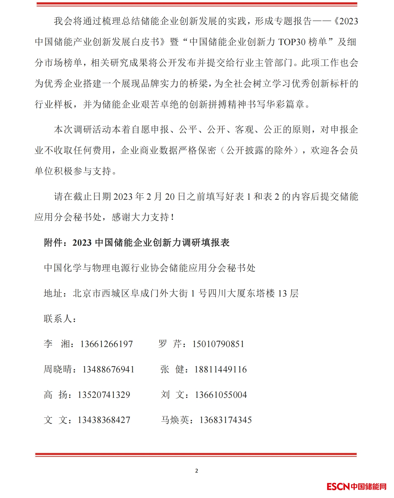 請(qǐng)?jiān)诮刂谷掌?023年2月20日之前填寫好表1和表2的內(nèi)容后提交儲(chǔ)能應(yīng)用分會(huì)秘書(shū)處,感謝大力支持!