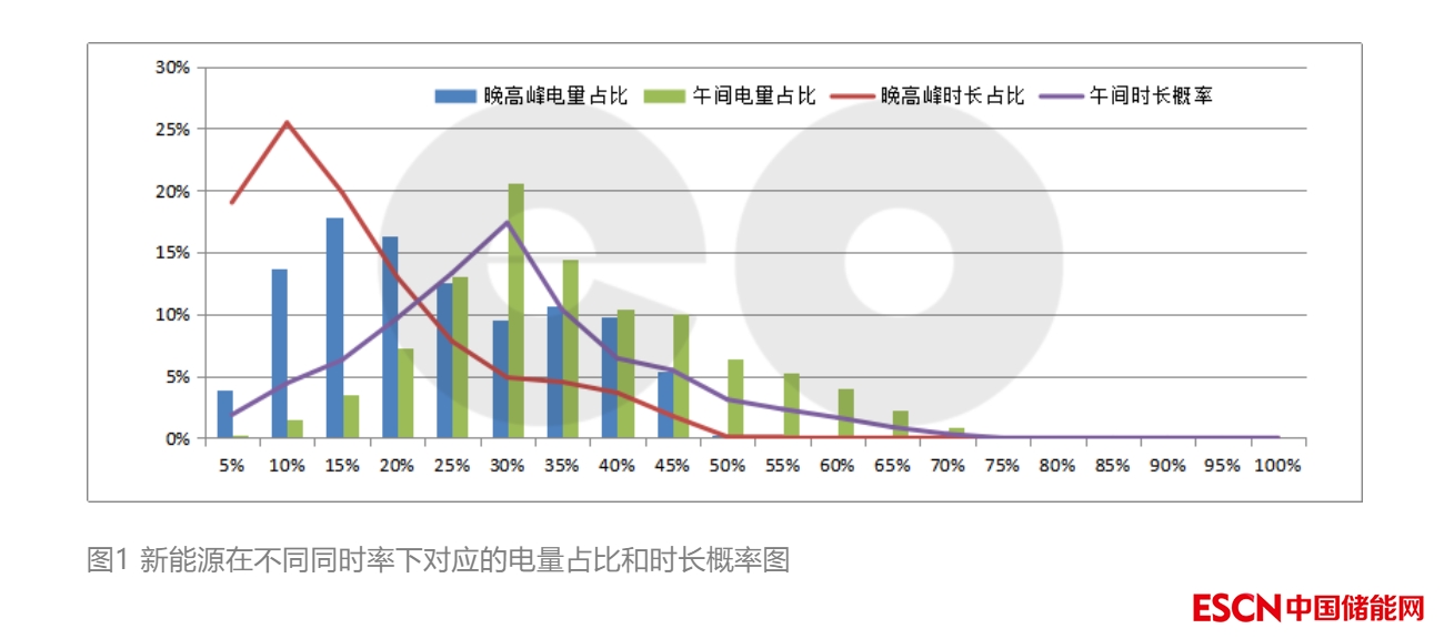 以甘肅電網(wǎng)為例,2021年甘肅新能源最大出力達(dá)到了1433萬(wàn)千瓦,最小出力僅為11萬(wàn)千瓦,最大出力是最小出力的130倍,新能源的尖峰出力很大,但持續(xù)時(shí)間較短。新能源電量集中在25%—35%同時(shí)率之間,如圖2所示。電網(wǎng)消納100%的電量需要1433萬(wàn)千瓦的消納能力,但消納95%的電量?jī)H需要1107萬(wàn)千瓦的消納能力,最后5%的電量占用了23%的消納能力。如果追求過(guò)高的電網(wǎng)利用率,會(huì)極大提高系統(tǒng)的備用率,帶來(lái)過(guò)高的邊際消納成本,影響整個(gè)能源系統(tǒng)經(jīng)濟(jì)性。