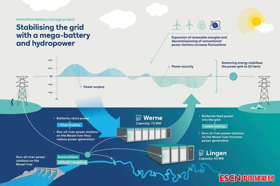 這二個電池儲能系統(tǒng)的特別之處在于它們與德國摩澤爾河沿岸的RWE徑流式水電站通過智能管理系統(tǒng)進行虛擬耦合連接。