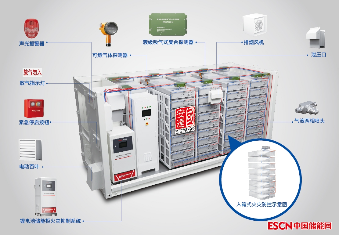 國安達(dá)新一代儲(chǔ)能站消防安全解決方案,推出創(chuàng)新研發(fā)的鋰電池儲(chǔ)能柜火災(zāi)抑制系統(tǒng),采用分簇式集中式探測(cè)、PACK級(jí)滅火防控技術(shù),以電池簇為防護(hù)單元,進(jìn)行極早期火情探測(cè)預(yù)警,以PACK為最小防護(hù)單元,進(jìn)行PACK級(jí)噴灑防控。當(dāng)該簇電池箱有單體電池出現(xiàn)熱失控時(shí),可及時(shí)接收并分析電池箱內(nèi)的火災(zāi)信息,輸出聲光報(bào)警信號(hào),同時(shí)將抑制介質(zhì)通過管路噴頭噴灑到發(fā)生熱失控的電池箱內(nèi)。