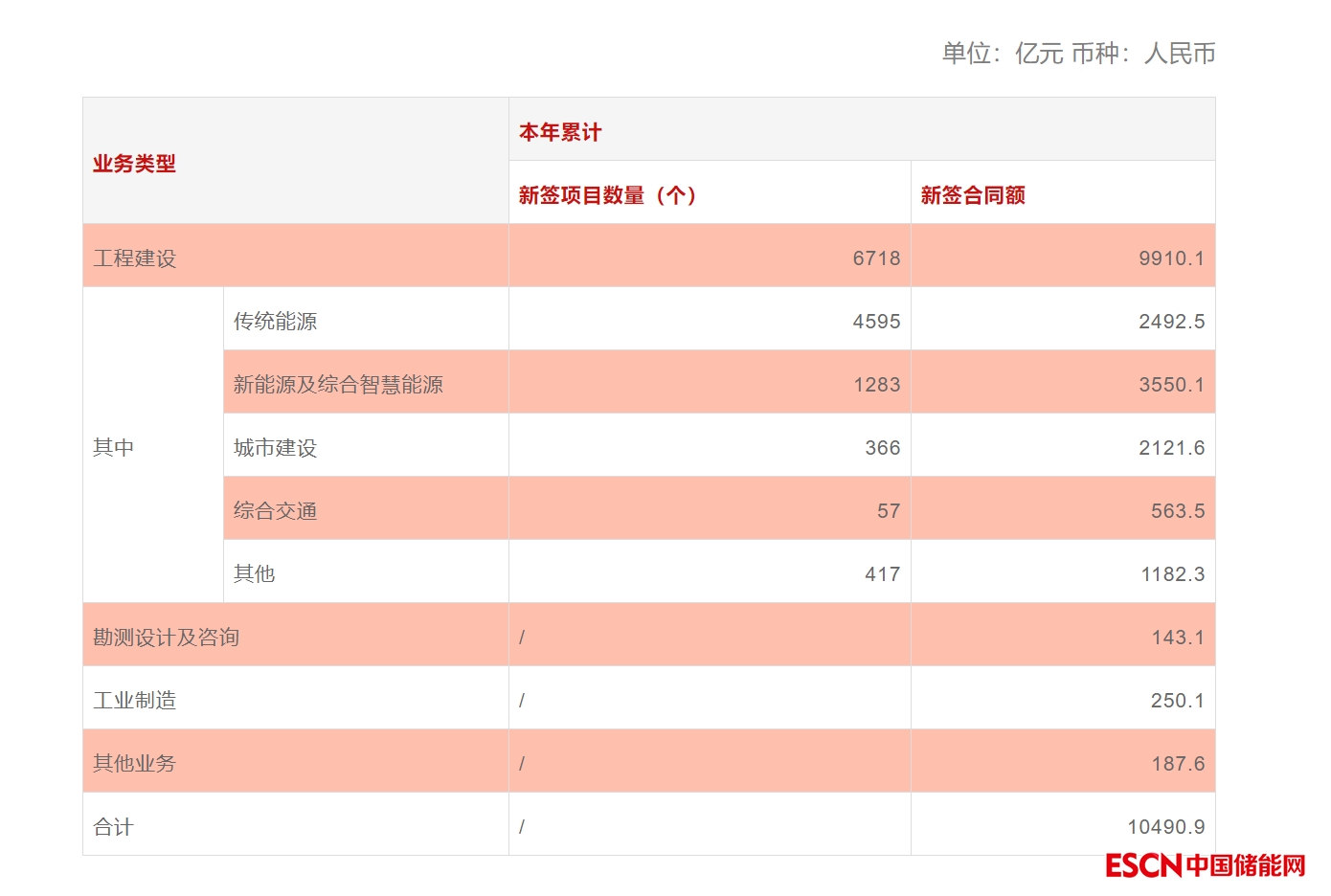 工程建設(shè)新簽合同額人民幣9910.1億元,同比增長(zhǎng)23.7%。其中傳統(tǒng)能源新簽合同額人民幣2492.5億元,同比增長(zhǎng)23.9%;新能源及綜合智慧能源新簽合同額人民幣3550.1億元,同比增長(zhǎng)83.9%;城市建設(shè)新簽合同額人民幣2121.6億元,同比增長(zhǎng)23.1%;其他新簽合同額人民幣1182.3億元,同比增長(zhǎng)26.9%。