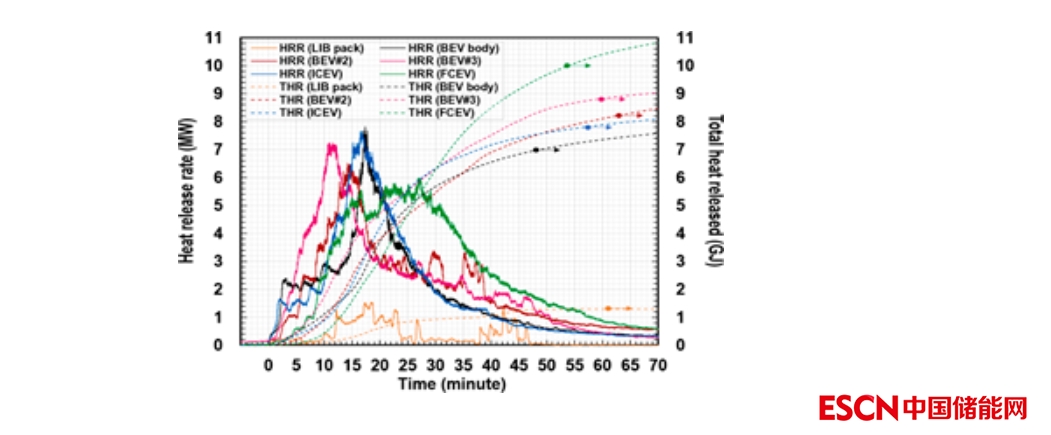 中國儲能網(wǎng)訊:伴隨著電動汽車市場份額的不斷增長,電動汽車著火事故頻發(fā)。來自應(yīng)急管理部消防救援局最新統(tǒng)計數(shù)據(jù)顯示,去年全年全國共接報電動汽車火災(zāi)事故超過2000起。電動汽車安全問題顯然已經(jīng)成為困擾行業(yè)發(fā)展的重要問題之一,近日韓國國家火災(zāi)實驗室公開了一份研究文獻,針對純電動汽車進行了全面的火災(zāi)實驗,重點研究了BEV火災(zāi)的熱行為。實驗以64kwhBEV汽車為研究對象,并選擇傳統(tǒng)燃油車和和氫燃料汽車為參照對象。研究結(jié)果顯示BEV燃燒持續(xù)大約70 分鐘,并測試了整個過程中峰值放熱功率 (pHRR)、總放熱量 (THR)、火勢增長參數(shù)和平均有效燃燒熱值,所測試的結(jié)果分別為6.51–7.25 MW、8.45–9.03 GJ、0.0085–0.020 和 29.8–30.5 MJ/kg,同時實驗數(shù)據(jù)顯示pHRR 和 THR 與座艙中可燃材料關(guān)聯(lián)程度更高,而與LIB熱失控關(guān)聯(lián)程度相對較低,即鋰離子電池?zé)崾Э匕l(fā)生后蔓延至汽車內(nèi)部其它可燃加速了BEV火勢的增長。