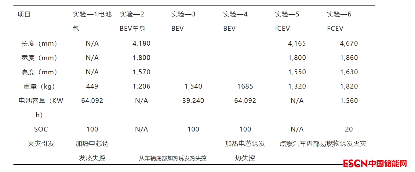 本次實驗共設(shè)計了六組實驗,實驗對象及誘發(fā)火災(zāi)具體條件如下表所示,為了使實驗數(shù)據(jù)更具說服力,分別針對不含電池組的BEV、電池組、以及含有電池組的BEV進行了火災(zāi)實驗。作為對比同時還選擇了傳統(tǒng)燃油車和氫燃料電池汽車作為對照組進行了對比實驗。其中BEV選著了兩款汽車,一款帶電量為39KWh(短續(xù)航),一款為64KWh(長續(xù)航),燃料電池汽車中電池組帶電量較小約1.5KWh,其中電荷狀態(tài)為20%SOC。BEV所采用的電芯為NCM622軟包電池,電池標(biāo)準(zhǔn)容量為60Ah,能量密度為245Wh/kg。