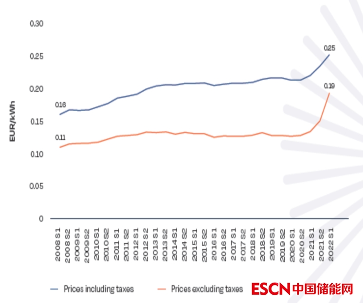 隨著全球經(jīng)濟(jì)在新冠疫情導(dǎo)致的放緩后恢復(fù)增長(zhǎng),對(duì)能源的需求也有所增長(zhǎng),導(dǎo)致包括電力在內(nèi)的價(jià)格大幅上漲。這種增長(zhǎng)也反映在家庭應(yīng)用上。歐洲平均電價(jià)在2021年首次超過(guò)0.19歐元/kWh,并在全年持續(xù)增長(zhǎng)。2022年2月發(fā)生的俄烏沖突導(dǎo)致了歐洲大陸出現(xiàn)能源危機(jī),隨著沖突的持續(xù),2022年電價(jià)趨勢(shì)加速至新的高度(見(jiàn)圖1.1)。