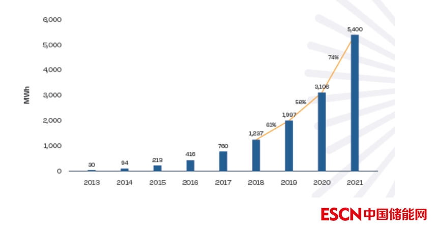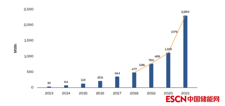 圖2.2 2013-2021年歐洲累積部署的住宅儲能市場發(fā)展趨勢