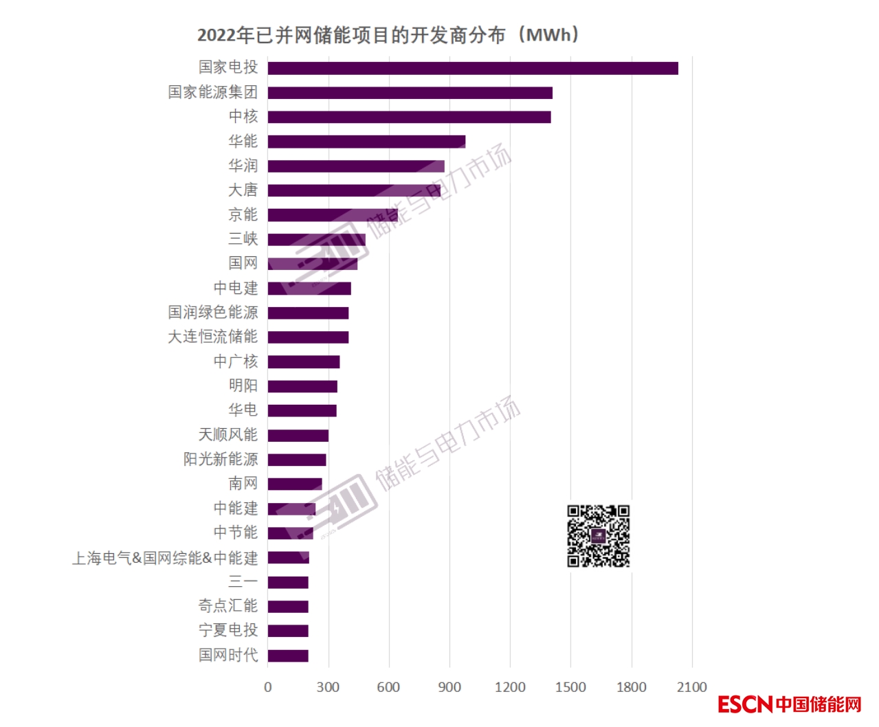 2022年已并網(wǎng)投運(yùn)的儲(chǔ)能項(xiàng)目來自近70家開發(fā)商。國(guó)電投、國(guó)家能源集團(tuán)、中核、華能、華潤(rùn)、大唐、京能、三峽、國(guó)網(wǎng)、中電建等央企開發(fā)商獨(dú)領(lǐng)風(fēng)騷,牢牢地守住了排行榜的前十位。