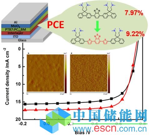 醇溶性的有機(jī)分子作為陰極界面材料,能夠降低ITO的功函,提高光伏器件的效率;而且這些材料溶解性好,可溶液加工成膜。中科院寧波材料所方俊鋒研究團(tuán)隊(duì)通過(guò)調(diào)控醇溶性共軛小分子的共軛單元,得到了能量轉(zhuǎn)化效率為9.2%的有機(jī)太陽(yáng)能電池器件,該結(jié)果達(dá)到了世界最高水平行列。研究發(fā)現(xiàn),具有更大共軛體系的醇溶性小分子能夠得到憎水性更強(qiáng)的陰極界面層,進(jìn)而改善活性層形貌,提高器件的短路電流Jsc和填充因子FF,得到高效率的器件,這一結(jié)果為人們開(kāi)發(fā)新的高效有機(jī)界面材料提供了新的設(shè)計(jì)思路。相關(guān)結(jié)果發(fā)表在Adv. Energy Mater.(10.1002/aenm.201400359),并申請(qǐng)了中國(guó)發(fā)明專(zhuān)利一項(xiàng)(201310264027.7)
