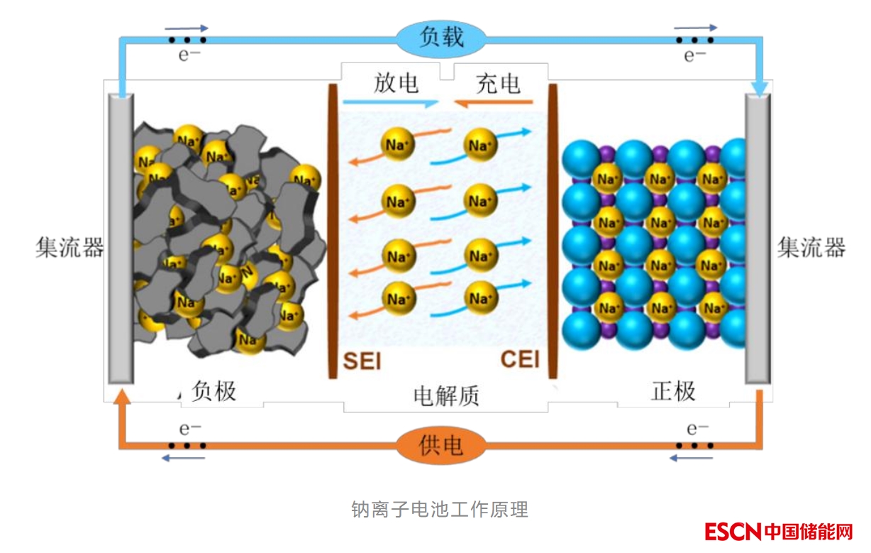 鈉離子電池是一種依靠鈉離子在正負極間移動來完成充放電工作的二次電池。鈉離子電池工作原理與鋰離子電池“搖椅式”原理相似,充電時,鈉離子從正極脫嵌,經(jīng)過電解質(zhì)嵌入負極;放電時則相反,與鋰離子電池的工作原理相似。