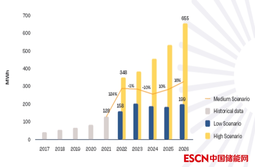 盡管英國直到最近還沒有推出支持計劃,但英國住宅電池儲能市場具有堅實的基礎(chǔ)。與許多其他歐洲國家一樣,由于電價上漲,英國儲能業(yè)務(wù)在2021年有所改善。預(yù)計英國在2022年將繼續(xù)保持其增長,并超過以往的部署記錄。在不斷增長的住宅光伏市場的支持下,根據(jù)對“中等情景”的預(yù)測,英國在2022年部署了288MWh的住宅電池儲能系統(tǒng),與2021年相比增長124%。
