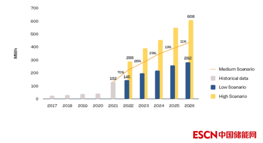 根據(jù)歐洲光伏產(chǎn)業(yè)協(xié)會進行的“中等情景”預(yù)測,隨著智能電表計劃在2024年完成,以及根據(jù)《可再生能源擴張法案》(EAG)實施的投資計劃,預(yù)計奧地利在2022年部署的住宅電池儲能系統(tǒng)儲能容量將達到223MWh,同比增長70%。隨著能源供應(yīng)市場不穩(wěn)定性的持續(xù),消費者將越來越多地部署住宅太陽能發(fā)電設(shè)施和住宅電池儲能系統(tǒng)。根據(jù) “中等情景”預(yù)測,奧地利在未來四年住宅電池儲能市場年增長率為11%~26%,與2022年相比,2026年將達到430MWh。然而在“高等情景”中,估計到2026年住宅電池儲能市場將增長40%以上,將達到608MWh(見圖4.4)。