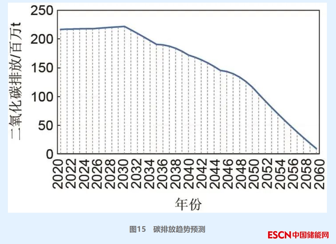 合成氨行業(yè)碳排放量方面,根據(jù)氫源供給結(jié)構(gòu)的LEAP模型預(yù)測結(jié)果得到合成氨行業(yè)的碳排放趨勢,如圖15所示。在可再生能源制氫降本速度加快和電解水裝機大規(guī)模部署下,預(yù)計我國合成氨行業(yè)將在2030年左右達(dá)峰,碳排放峰值為2.22億噸二氧化碳。此后碳排放逐年減少,2060年碳排放降至920萬噸。