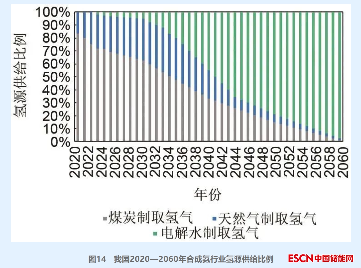 當(dāng)前合成氨行業(yè)的氫源主要來自于煤氣化制氫和天然氣重整制氫等非低碳?xì)?,全部?yīng)用于傳統(tǒng)農(nóng)業(yè)與工業(yè)部門。未來,在傳統(tǒng)合成氨應(yīng)用領(lǐng)域,隨著可再生能源電解水制氫逐步具有競爭力,同時考慮到可再生氫與CCS技術(shù)經(jīng)濟性均在2030年左右顯現(xiàn),而CCS技術(shù)為過渡性技術(shù),產(chǎn)業(yè)投資熱情遠(yuǎn)低于可再生能源電解水制氫技術(shù),因此本文預(yù)測現(xiàn)有非低碳?xì)溆煽稍偕鷼渲鸩教娲?。在新興合成氨應(yīng)用領(lǐng)域,其產(chǎn)業(yè)部署主要受脫碳因素驅(qū)動,本文對需求量預(yù)測基于可再生氫成本下降發(fā)展趨勢,因此,船舶運輸用氨燃料以及氨發(fā)電領(lǐng)域的氫全部來源于可再生氫。2030年后可再生氫部署加快,2035年可再生氫占比20%,2040年可再生氫將在合成氨氫源結(jié)構(gòu)中占主導(dǎo)地位,到2060年可再生氫所占比例將會達(dá)到97%以上。如圖14所示。