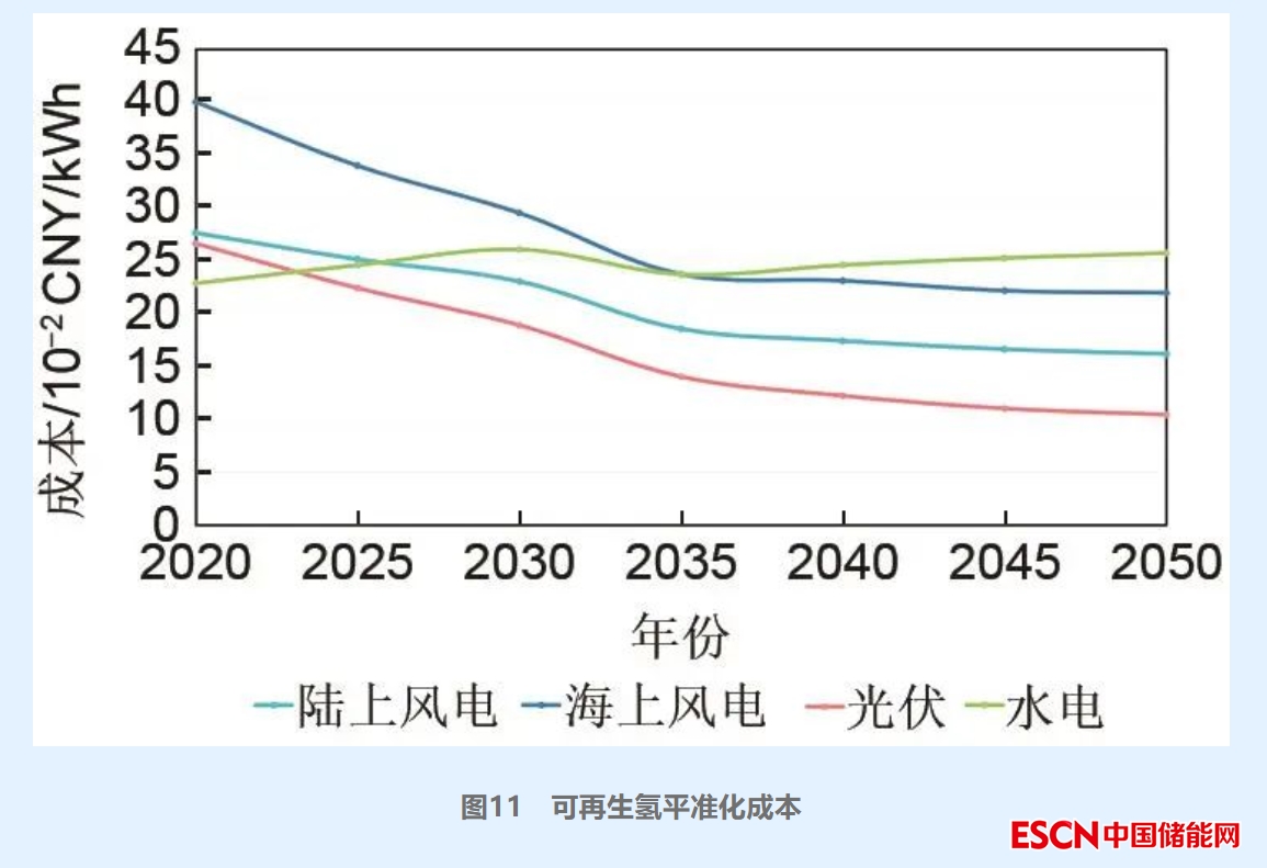 可再生氫:可再生氫的成本決定了綠氨在交通與發(fā)電領(lǐng)域的市場滲透率。如圖11所示,以2000 m3/h堿性電解水制氫項目為例,負(fù)荷率95%條件下,當(dāng)前水電、陸上風(fēng)電、海上風(fēng)電、光伏的度電平準(zhǔn)化成本分別為0.33 CNY/kWh、0.41 CNY/kWh、0.63 CNY/kWh、0.40 CNY/kWh,對應(yīng)的平準(zhǔn)化氫氣成本分別為22.89 CNY/kg氫氣、27.65 CNY/kg氫氣、40.05 CNY/kg氫氣、26.65 CNY/kg氫氣。其中度電成本對可再生氫成本的影響敏感性最高,約占總成本的70%~90%??稍偕茉囱b機規(guī)模擴大和技術(shù)持續(xù)進(jìn)步將推動可再生能源發(fā)電成本下降。到2035年后,光伏與風(fēng)電的新增裝機發(fā)電成本預(yù)計分別降至0.2 CNY/kWh和0.3 CNY/kWh。到2050年新增光伏和風(fēng)電發(fā)電成本將降至約0.13 CNY/kWh和0.25 CNY/kWh,風(fēng)能和太陽能將成為最廉價和最豐富的電力來源??稍偕茉措娊馑茪涑杀緦⒌椭?1.63 CNY/kg氫氣,不考慮碳稅情況下,已明顯低于化石能源+碳捕集與封存(CCS)制氫成本。