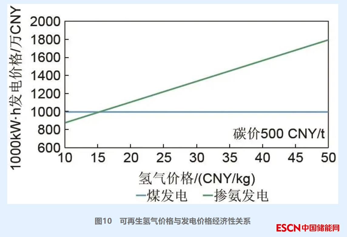 燃燒發(fā)電:本文以火力發(fā)電的經(jīng)濟性和摻氨35%的經(jīng)濟性進(jìn)行對比。為了更好展現(xiàn)經(jīng)濟性對比結(jié)果,本文主要考慮不同燃料以及碳價對發(fā)電的經(jīng)濟性影響,暫未考慮設(shè)備改造以及人工折舊等費用?,F(xiàn)役燃煤火力發(fā)電廠平均供電煤耗以320 g標(biāo)煤/kWh計算,燃煤摻氨熱量比以35%計算,根據(jù)氨的燃燒熱值與標(biāo)準(zhǔn)煤的排放系數(shù)進(jìn)行經(jīng)濟性計算對比如圖10,在考慮兩種發(fā)電技術(shù)產(chǎn)生的碳效益,并根據(jù)標(biāo)準(zhǔn)煤的碳排放系數(shù)計算各自發(fā)電過程中的碳排放,在煤炭價格為1400 CNY/t、碳價為500 CNY/t時,可再生氫氣價格為16 CNY/kg左右,合成氨的成本為3275 CNY/t,燃煤摻氨發(fā)電才具備經(jīng)濟性。