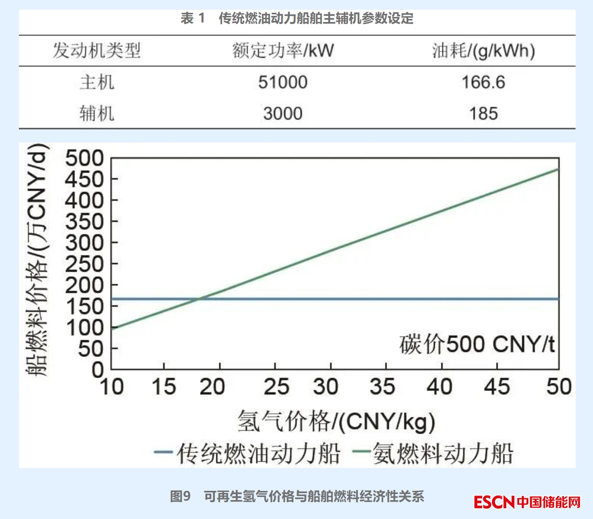 船舶運輸燃料:傳統(tǒng)燃油動力船主動力和輔助動力均采用柴油發(fā)動機,燃料為重油。氨燃料動力船,主動力采用氨發(fā)動機,輔助動力采用氫燃料電池。根據(jù)表1假設(shè)的傳統(tǒng)燃油動力船舶主輔機參數(shù)與亞歐航線設(shè)定,計算得到主機、輔機的油耗分別為240 t/d和16 t/d。由于目前氨動力總成尚未投入市場,由此采用等量熱值法換算得到氨動力船舶氨的消耗量為419 t/d,折合氫耗為9 t/d。經(jīng)濟性分析如圖9所示,當(dāng)重油價格為4000 CNY/t時,在考慮傳統(tǒng)動力船的碳排放情況下,根據(jù)重油的碳排放系數(shù),當(dāng)碳價為500 CNY/t時,可再生氫氣價格為18 CNY/kg時,合成氨成本為3684 CNY/t,這時氨燃料動力船具有成本競爭性。