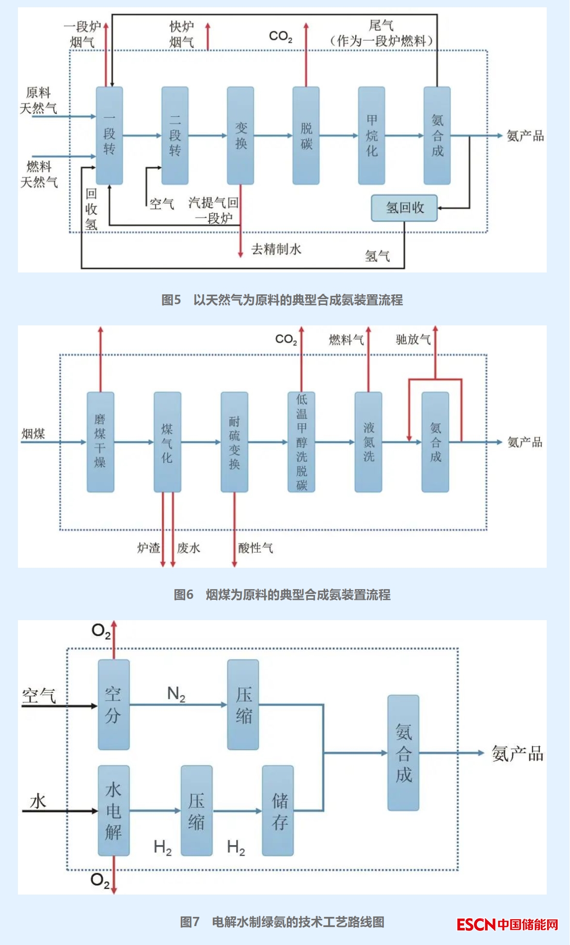 目前,Haber-Bosch法仍是全球唯一具有工業(yè)級規(guī)模的合成氨技術(shù),該法主要包含造氣、凈化、壓縮合成三個主要步驟。一是造氣,即以天然氣、煤為原料,制備含有氫氣、氮氣、一氧化碳的粗原料氣;二是凈化,造氣過程中制得的粗氣含有一氧化碳、二氧化碳等雜質(zhì),這些雜質(zhì)不能腐蝕管道設(shè)備,而且能使催化劑中毒,因此在氫氮原料氣送往合成塔之前必須進(jìn)行凈化處理,除去各種雜質(zhì),獲得純凈的氨氮混合氣;三是壓縮與合成,這主要是Haber-Bosch工藝,將純凈的氫氮混合原料氣壓縮到高壓,在催化劑及高溫條件下合成氨??稍偕娏铣砂奔夹g(shù)以清潔能源電解水生成的氫氣取代傳統(tǒng)工藝中的化石能源(煤、天然氣),與從空分系統(tǒng)中得到的氮氣反應(yīng)生成氨。以天然氣、煤炭和電解水制氫為原料的典型合成氨裝置流程如圖5、圖6和圖7。