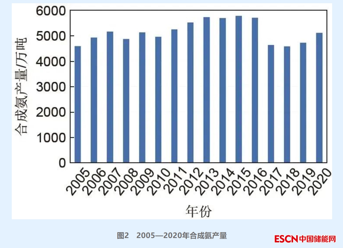 我國是最大的氨生產(chǎn)國,產(chǎn)量占全球產(chǎn)量的30%。根據(jù)國家統(tǒng)計局統(tǒng)計,我國2005—2020年合成氨產(chǎn)量如圖2所示,自2005年以來,我國合成氨產(chǎn)量逐年攀升,至2015年達(dá)到峰值5791萬噸。十三五以來,工業(yè)和信息化部要求重點行業(yè)淘汰落后以及過剩產(chǎn)能,其中合成氨行業(yè)不得少于1000萬噸,近5年以來,我國合成氨伴隨著環(huán)保限產(chǎn)以及落后產(chǎn)能的淘汰,產(chǎn)量逐年減少,于2018年達(dá)到最低位4587萬噸。