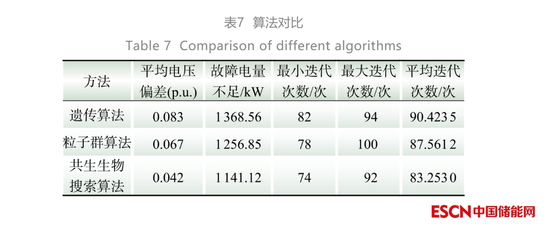 為驗(yàn)證共生生物搜索算法的可行性和優(yōu)越性,將共生生物搜索算法和遺傳算法[24]、粒子群算法[25]進(jìn)行對(duì)比,得到的相關(guān)數(shù)據(jù)如表7所示。由表7可知,相對(duì)于另外2種算法,采用共生生物搜索算法進(jìn)行計(jì)算時(shí),得到的平均電壓偏差以及故障情況下的電量不足都較小。此外,由最大迭代次數(shù)、最小迭代次數(shù)和平均迭代次數(shù)也可以看出,共生生物搜索算法相對(duì)另外2種算法在穩(wěn)定性和收斂性方面具有優(yōu)勢(shì)。