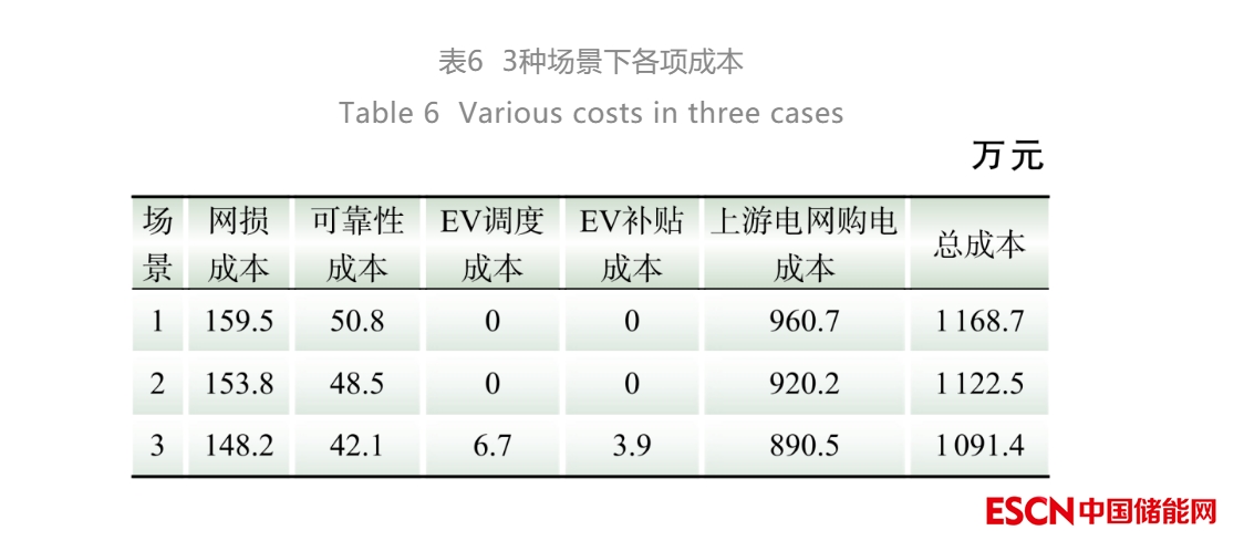 為驗(yàn)證考慮DG和EV集群調(diào)度的配電網(wǎng)絡(luò)重構(gòu)的經(jīng)濟(jì)性,設(shè)置3種場(chǎng)景分別計(jì)算其各項(xiàng)成本進(jìn)行對(duì)比。場(chǎng)景1:既不考慮DG也不考慮EV集群調(diào)度的配電網(wǎng)絡(luò)重構(gòu);場(chǎng)景2:只考慮DG但不考慮EV集群調(diào)度的配電網(wǎng)絡(luò)重構(gòu);場(chǎng)景3:既考慮DG同時(shí)也考慮EV集群調(diào)度的配電網(wǎng)絡(luò)重構(gòu)。3種場(chǎng)景下計(jì)算的各項(xiàng)成本如表6所示。