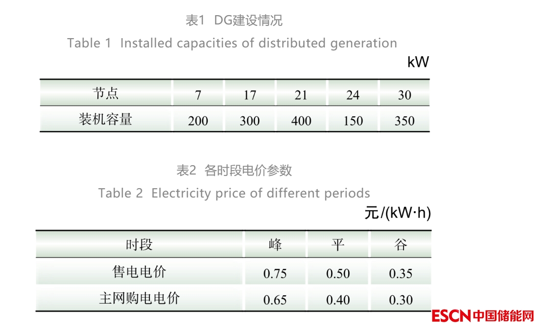 假設(shè)DG為分布式光伏,相關(guān)數(shù)據(jù)如表1所示。在分時(shí)電價(jià)基礎(chǔ)上,將一天24 h負(fù)荷的變化劃分為負(fù)荷高峰、負(fù)荷平穩(wěn)、負(fù)荷低谷時(shí)段,各時(shí)段的電價(jià)和相關(guān)參數(shù)如表2所示。在表2中,負(fù)荷高峰具體時(shí)段為10:00—12:00、20:00—22:00,負(fù)荷平穩(wěn)具體時(shí)段位為08:00—09:00、13:00—19:00、23:00—00:00,負(fù)荷低谷具體時(shí)段為01:00—07:00。