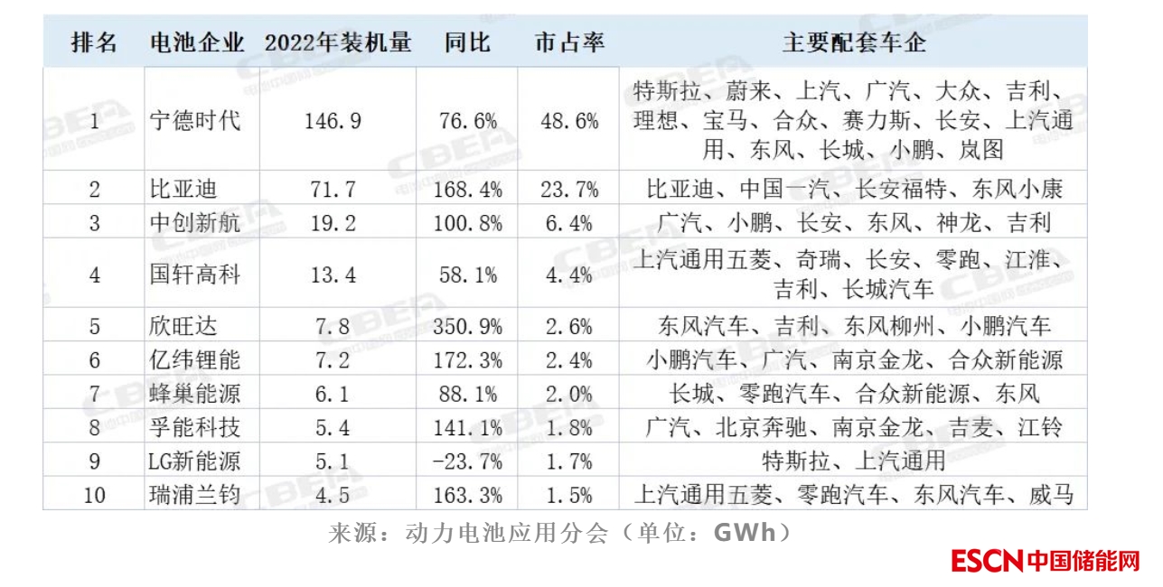 2022年TOP15企業(yè)排名依次為:寧德時(shí)代、比亞迪(弗迪電池)、中創(chuàng)新航、國(guó)軒高科、欣旺達(dá)、億緯鋰能、蜂巢能源、孚能科技、LG新能源、瑞浦蘭鈞、正力新能、捷威動(dòng)力、多氟多、力神電池、鵬輝能源。