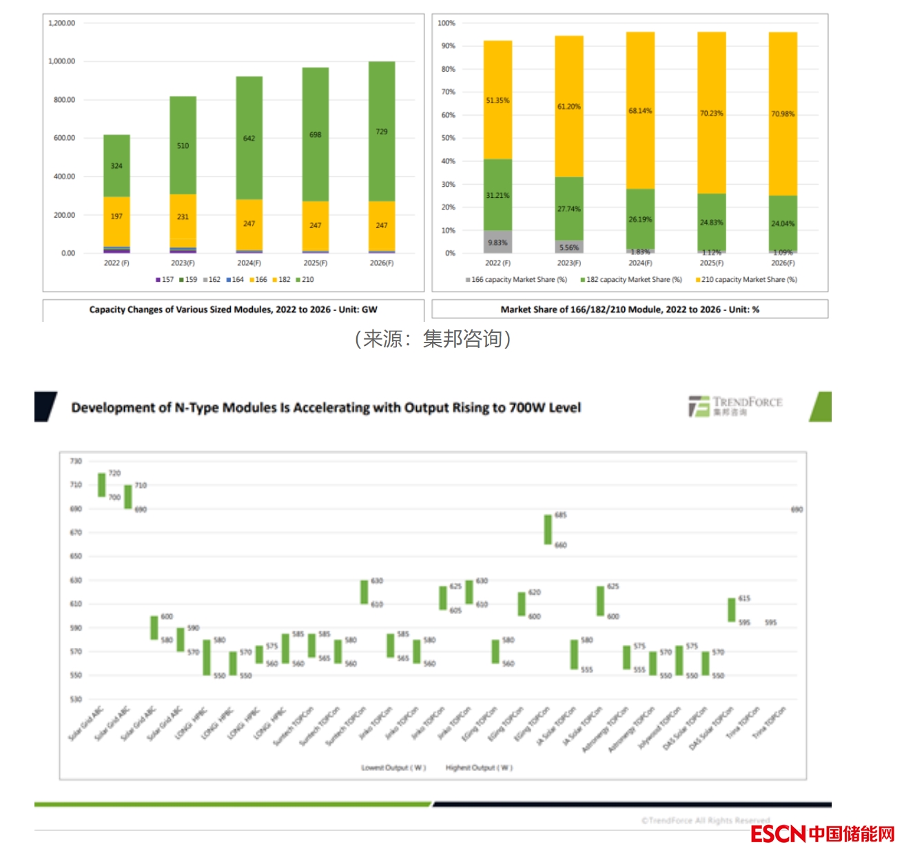 集邦咨詢的《N型技術(shù)發(fā)展趨勢展望》顯示,2023年大尺寸組件產(chǎn)能繼續(xù)擴張,到今年年底,210尺寸組件產(chǎn)能占比達61.2%。從技術(shù)路線來看,2023年電池片產(chǎn)能擴張以N型為主。N型時代已經(jīng)到來。隨著N型組件產(chǎn)品布局的加速,組件功率已然朝著700W邁進。