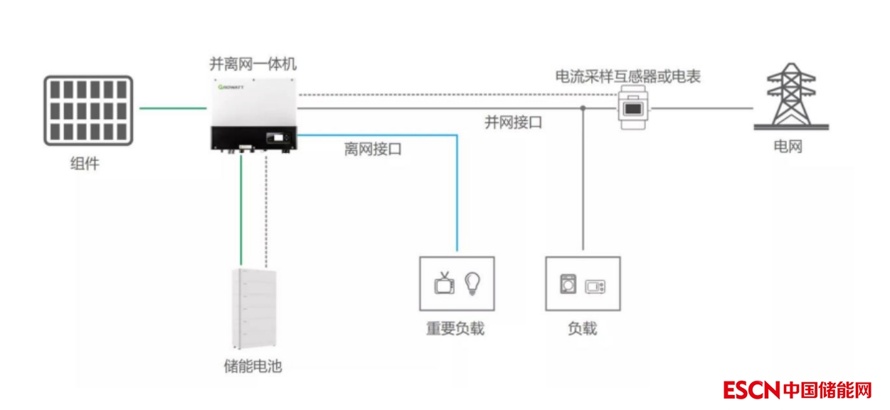 并離網(wǎng)系統(tǒng)的特點是既可以并網(wǎng)運行,也可以在電網(wǎng)斷電時單獨運行為重要負載供電。適用于電力系統(tǒng)不穩(wěn)定、自發(fā)自用不能上網(wǎng)、自用電價比上網(wǎng)電價貴等應(yīng)用場景。系統(tǒng)一般由太陽電池組件組成的光伏方陣、并離網(wǎng)一體機、蓄電池組、負載、電網(wǎng)等構(gòu)成。