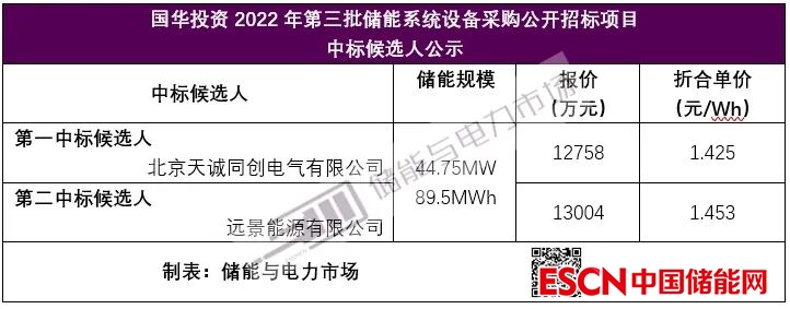 中國儲(chǔ)能網(wǎng)訊:國華投資2022年第三批儲(chǔ)能系統(tǒng)設(shè)備采購公開招標(biāo)項(xiàng)目發(fā)布了中標(biāo)候選人公示。北京天誠同創(chuàng)電氣有限公司以總報(bào)價(jià)12758萬元,折合單價(jià)1.425 元/Wh,成為第一中標(biāo)候選人。中標(biāo)候選人情況如下表所示: