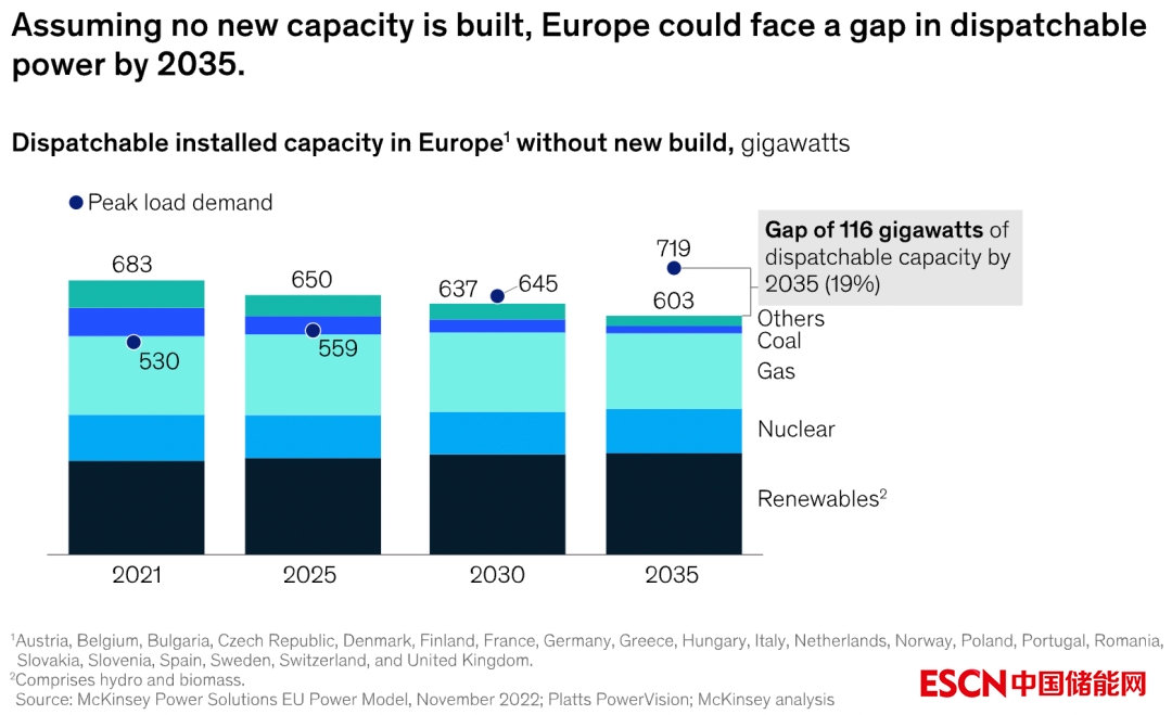 在未來幾年中,峰值電力負荷與可啟動以滿足其需求的可調(diào)度電力容量之間將出現(xiàn)差距。隨著天然氣、核能和水力發(fā)電比例持續(xù)下降,而電力峰值負荷增加,預(yù)計可調(diào)度發(fā)電容量短缺情況將進一步惡化。到2035年,歐洲的缺口將相當于可調(diào)度容量的19%,即116吉瓦。歐洲目前正在努力用清潔的可調(diào)度電源能力來源來彌補這一差距。在過去十年中,在公用事業(yè)規(guī)模的電池系統(tǒng)、生物質(zhì)和氫氣方面進行了大量投資。模型表明,到2035年,將需要超過100吉瓦的儲能電池容量、5至10吉瓦的生物質(zhì)容量和20至30吉瓦的氫電解槽容量來滿足峰值負荷。然而,由于依賴支持性法規(guī)、政府激勵措施的可用性以及對鋰等短缺原材料的需求,這些項目的建設(shè)面臨高度不確定。