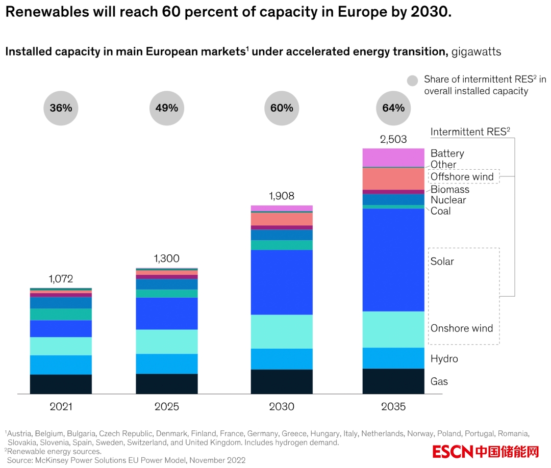 風(fēng)能和太陽能在歐洲電力結(jié)構(gòu)中的滲透率將大幅增長。到2030年,這些可再生能源是歐洲脫碳努力的關(guān)鍵組成部分,預(yù)計將提供歐洲大陸60%的能源容量。這幾乎是2021年可再生能源份額的兩倍,在2021至2030年間增加760吉瓦。但這并不容易實現(xiàn),政策制定者、監(jiān)管機構(gòu)和可再生能源開發(fā)商面對合適的土地和具備所需技能的人才供應(yīng)短缺,以及供應(yīng)鏈問題和原材料短缺的挑戰(zhàn)。此外,由于風(fēng)力和太陽能發(fā)電受到自然變化的影響,其間歇性還需要建設(shè)平衡資源(如氫氣、儲能電池、需求側(cè)響應(yīng)和生物質(zhì)電廠)。