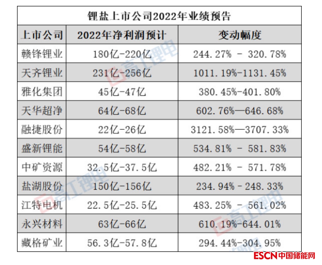 開年至今,鋰鹽上市公司陸續(xù)披露2022年業(yè)績(jī)預(yù)告,業(yè)績(jī)利潤(rùn)及增速一家驚艷過一家。其中,融捷股份最高預(yù)增超37倍,天齊鋰業(yè)最高預(yù)增超過11倍;其余上市公司預(yù)增也均達(dá)到三位數(shù)。