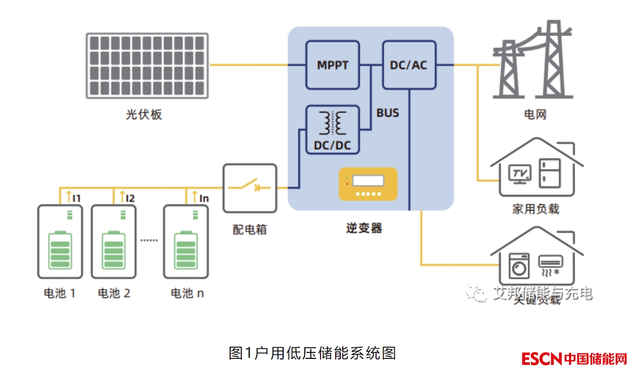 戶用低壓儲(chǔ)能系統(tǒng)是指電池電壓范圍40~60V的儲(chǔ)能系統(tǒng),由若干個(gè)電池并聯(lián)后連接到逆變器,經(jīng)逆變器內(nèi)部的隔離DC-DC,在母線處與光伏MPPT輸出的直流電交匯耦合,最終通過(guò)逆變輸出轉(zhuǎn)化為交流電并網(wǎng),部分逆變器具備有后備輸出功能。