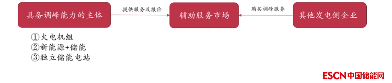 發(fā)電側(cè)提供調(diào)峰服務(wù),在電力輔助服務(wù)市場進行交易;收益來源:市場化交易