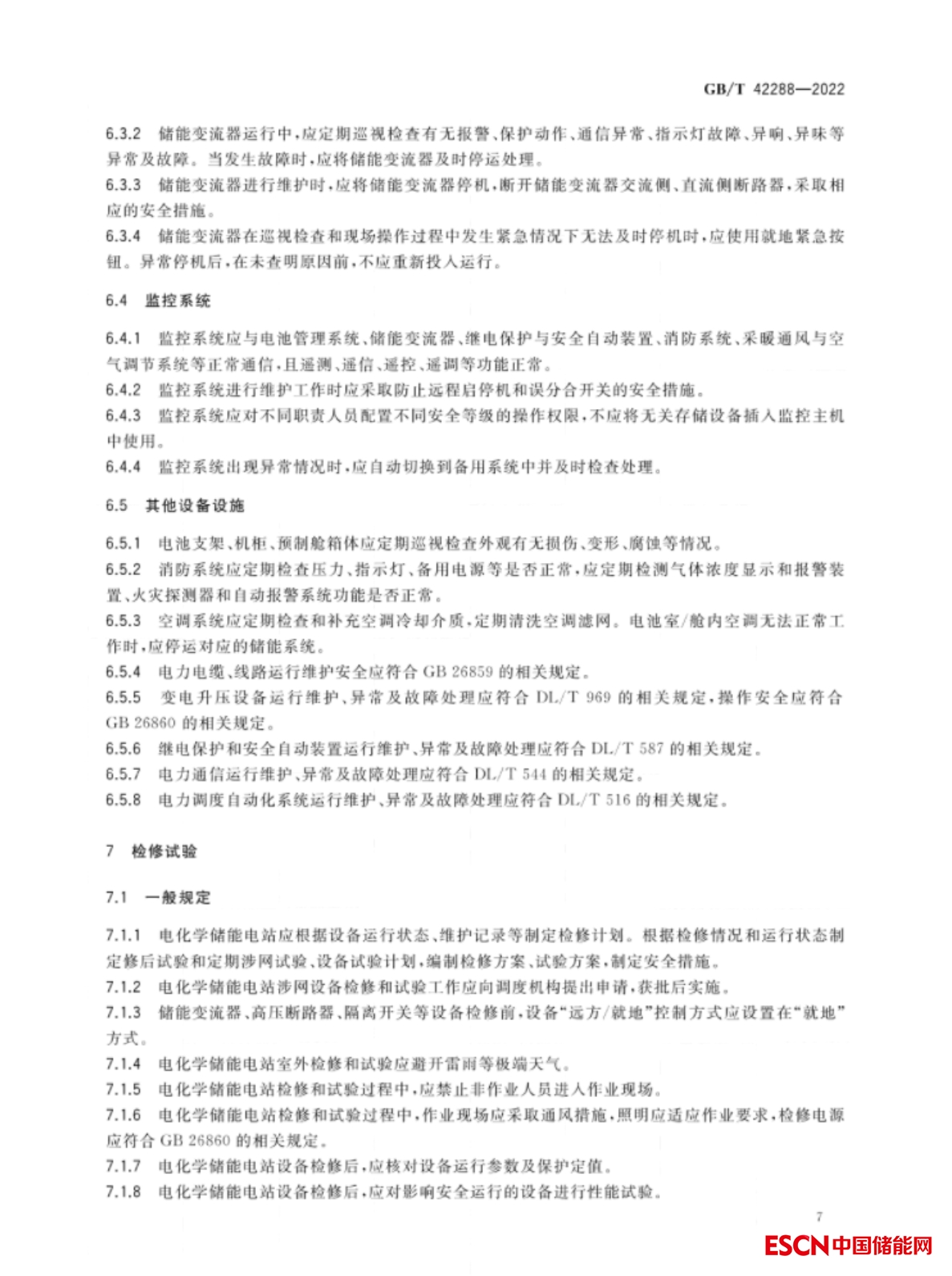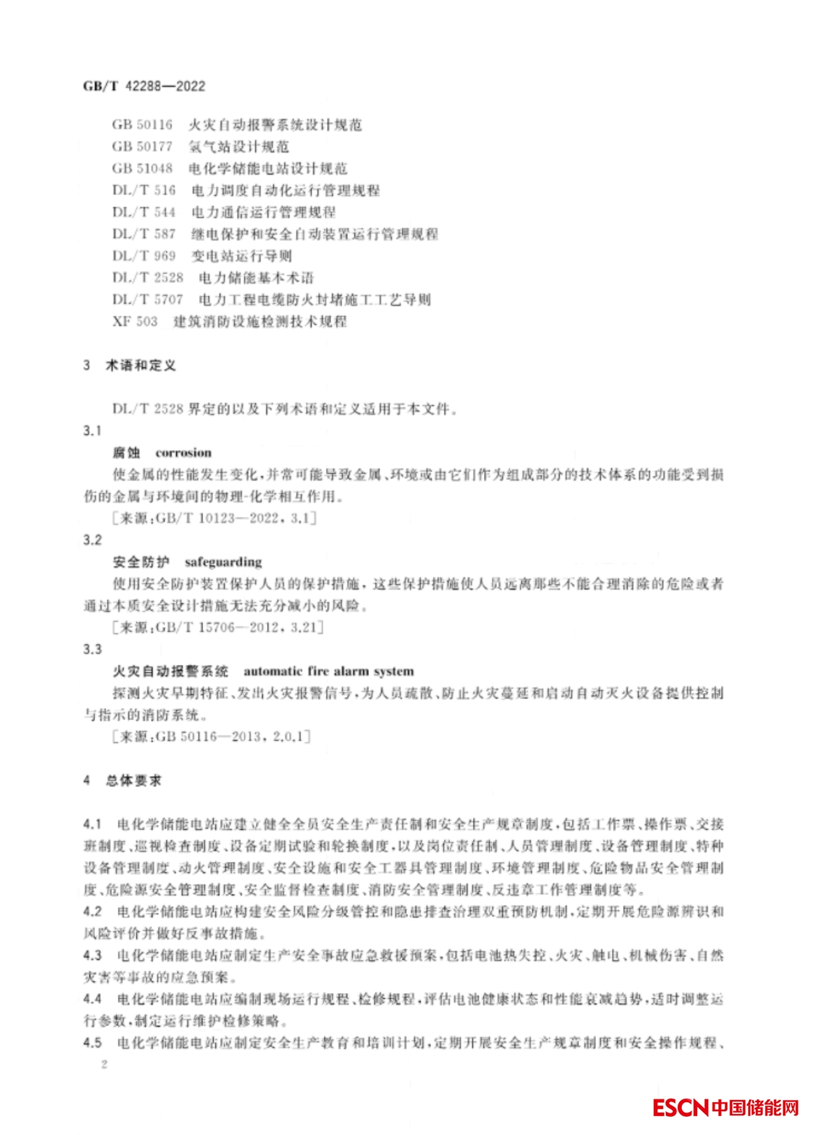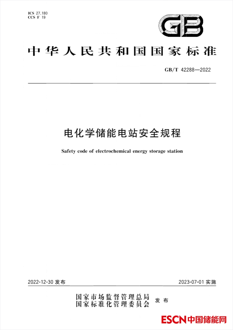 中國儲能網(wǎng)訊:近日,全國標(biāo)準(zhǔn)信息公共服務(wù)平臺發(fā)布了國家標(biāo)準(zhǔn)《電化學(xué)儲能電站安全規(guī)程》全文,該標(biāo)準(zhǔn)將于2023年7月1日正式實(shí)施 。該項(xiàng)國家標(biāo)準(zhǔn)針對電化學(xué)儲能電站的設(shè)備設(shè)施、運(yùn)行維護(hù)、檢修試驗(yàn)、應(yīng)急處置等提出明確的安全要求,適用于鋰離子電池、鉛酸(炭)電池、液流電池、水電解制氫/燃料電池電化學(xué)儲能電站,其他類型的電化學(xué)儲能電站可參照使用。