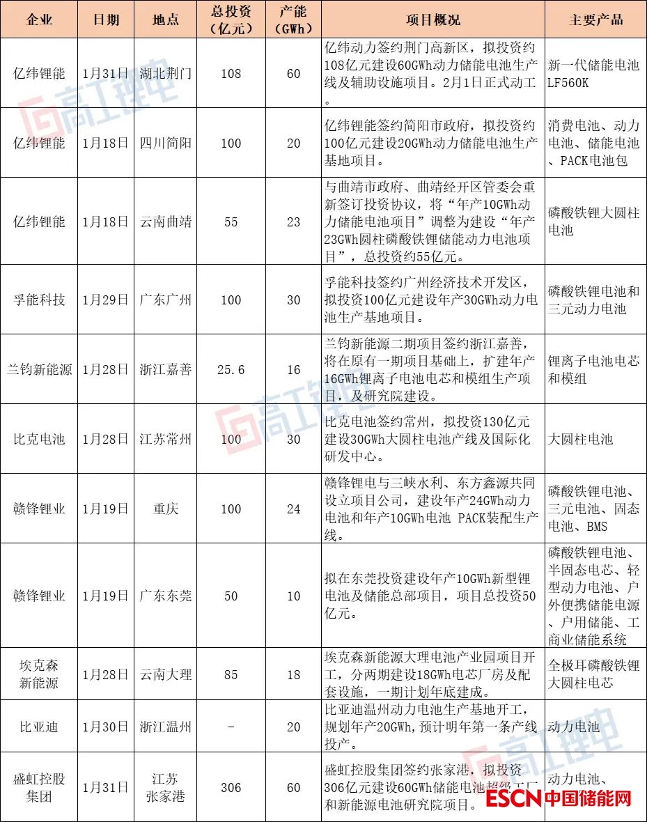 高工鋰電注意到,僅1月份,包括億緯鋰能、孚能科技、蘭鈞新能源、比克電池、贛鋒鋰電、??松履茉?、比亞迪、盛虹控股集團(tuán)等紛紛宣布擴(kuò)產(chǎn)。涉及動(dòng)力及儲(chǔ)能電池?cái)U(kuò)產(chǎn)規(guī)劃及開(kāi)工項(xiàng)目多達(dá)11起,總產(chǎn)能達(dá)311GWh,投資總額超1000億元。