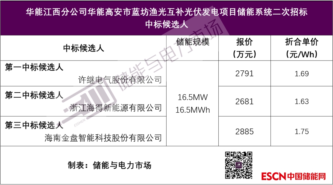 許繼電氣股份有限公司總報(bào)價(jià)2791萬元,折合單價(jià)1.69元/Wh,成為第一中標(biāo)候選人。