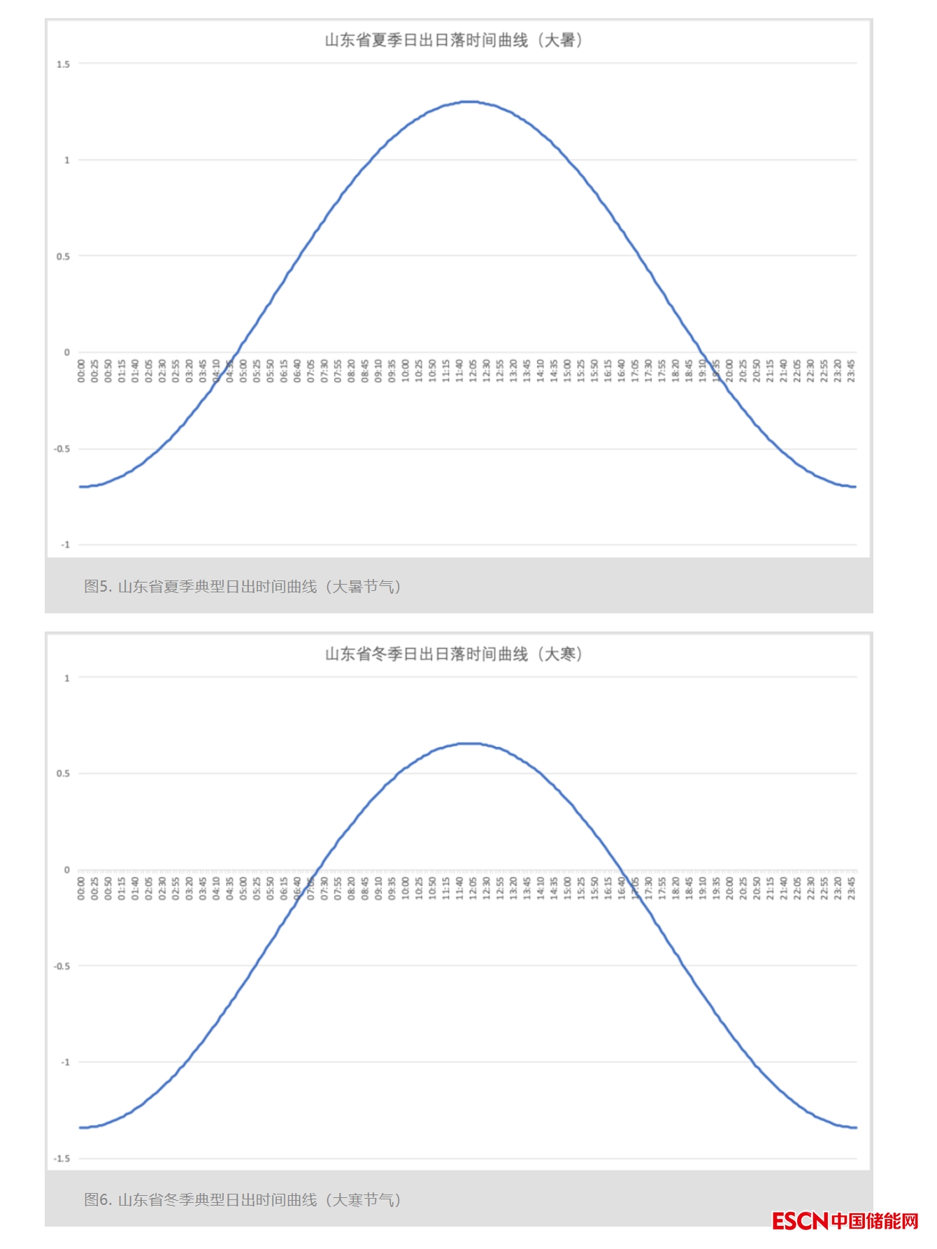 結(jié)合下圖5,6,根據(jù)山東省典型的日出日落時(shí)間(北緯37°),對(duì)于光伏出力的高峰期,電價(jià)信號(hào)都給出了明確的指示(如圖2,4),可見光伏發(fā)電的比例對(duì)于山東電網(wǎng)的影響已經(jīng)達(dá)到了較高的水平。
